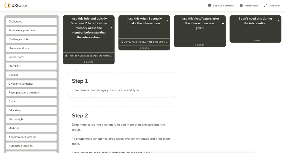 Card Sorting: Multiple exercises to understand how users naturally organize and prioritize information, including frequent actions, workflow-based sorting, and information categorization